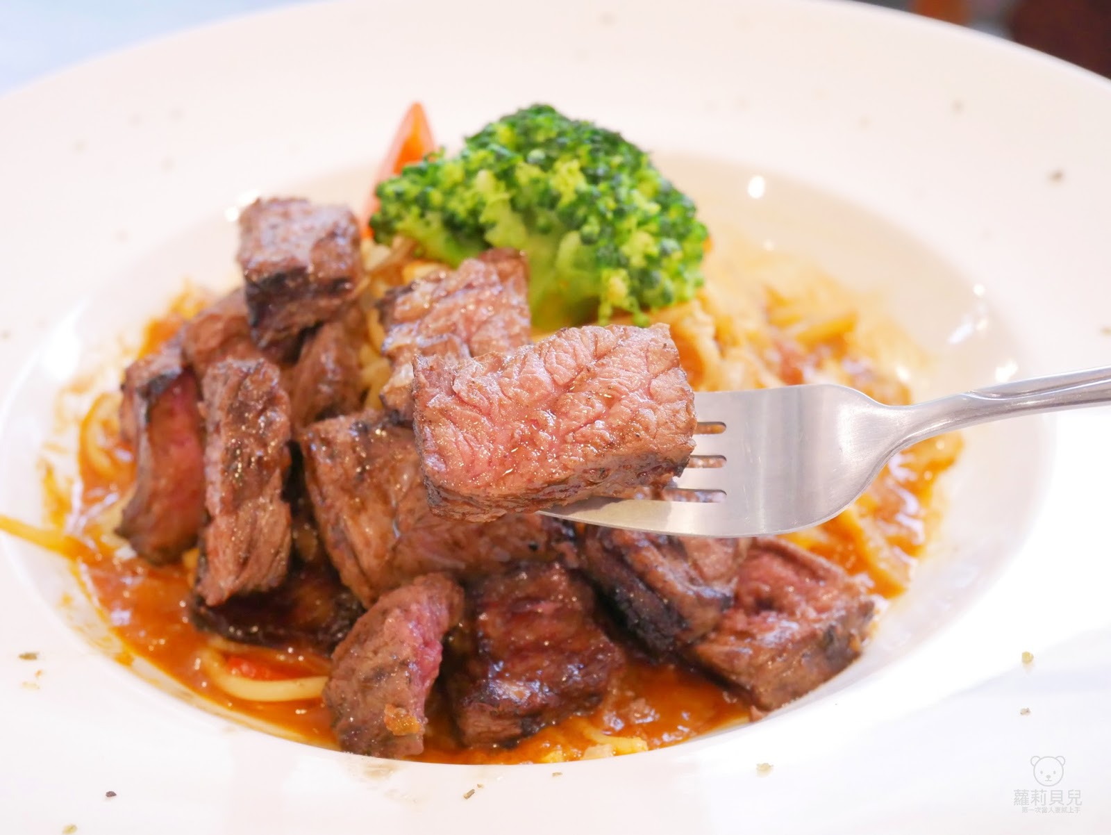 話說主廚可是把整塊的菲力牛排放在義大利麵上了