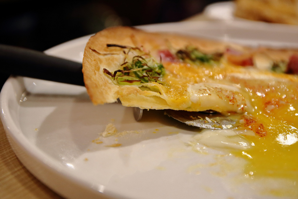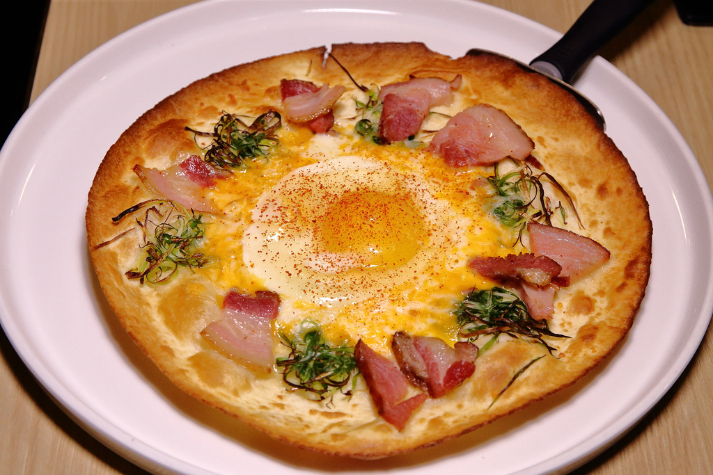薄片披薩我最愛,香氣撲鼻端上桌,培根再混著一顆香滑溫泉蛋,