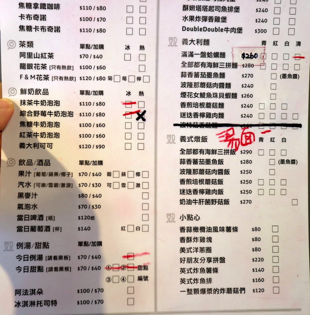 店家在週末的兩點半過後,提供下午茶組合。點選飲料或甜點,都是主餐的加購價優惠。