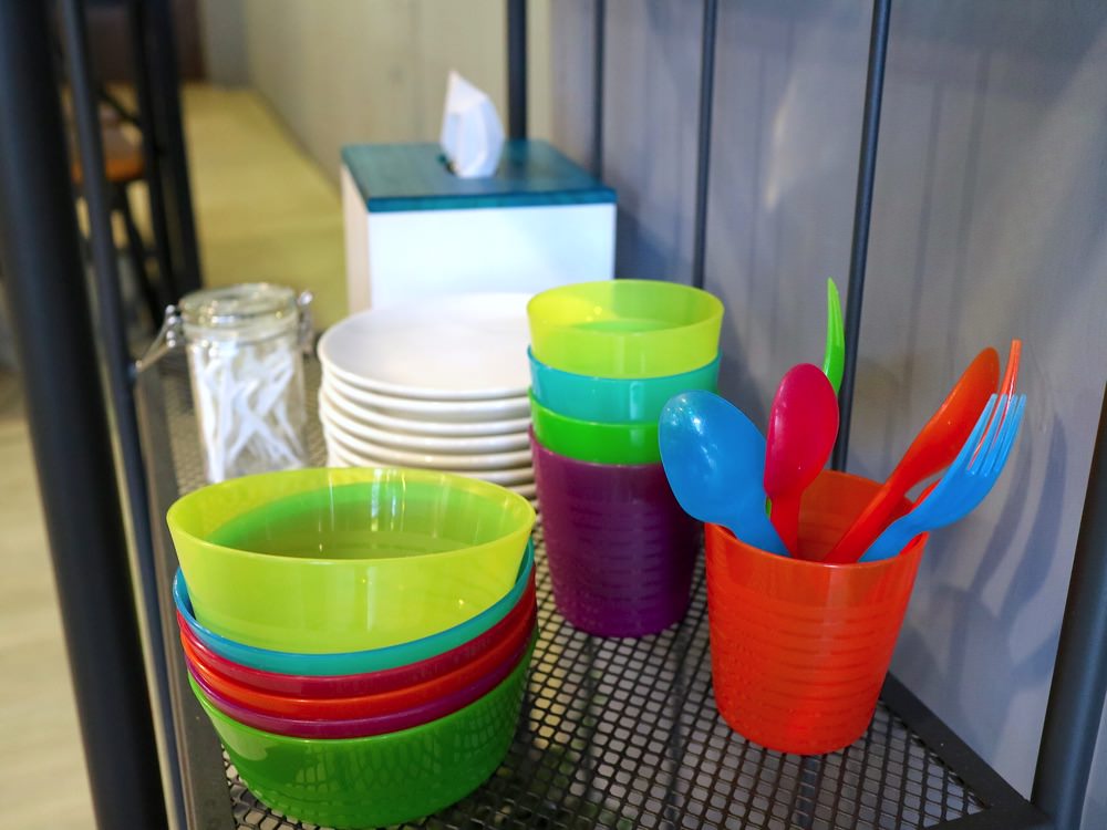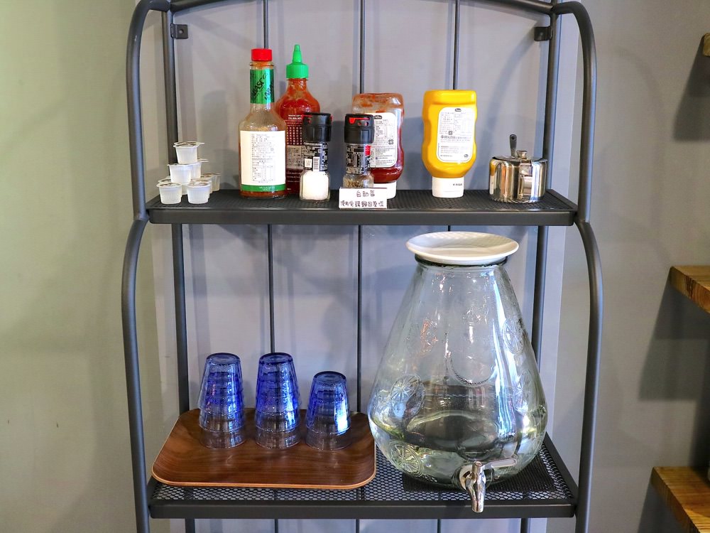 餐具自助區,有著杯水/各式醬料/兒童餐具。