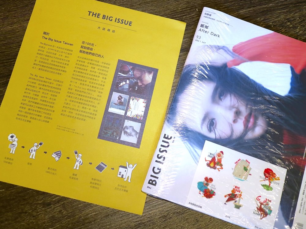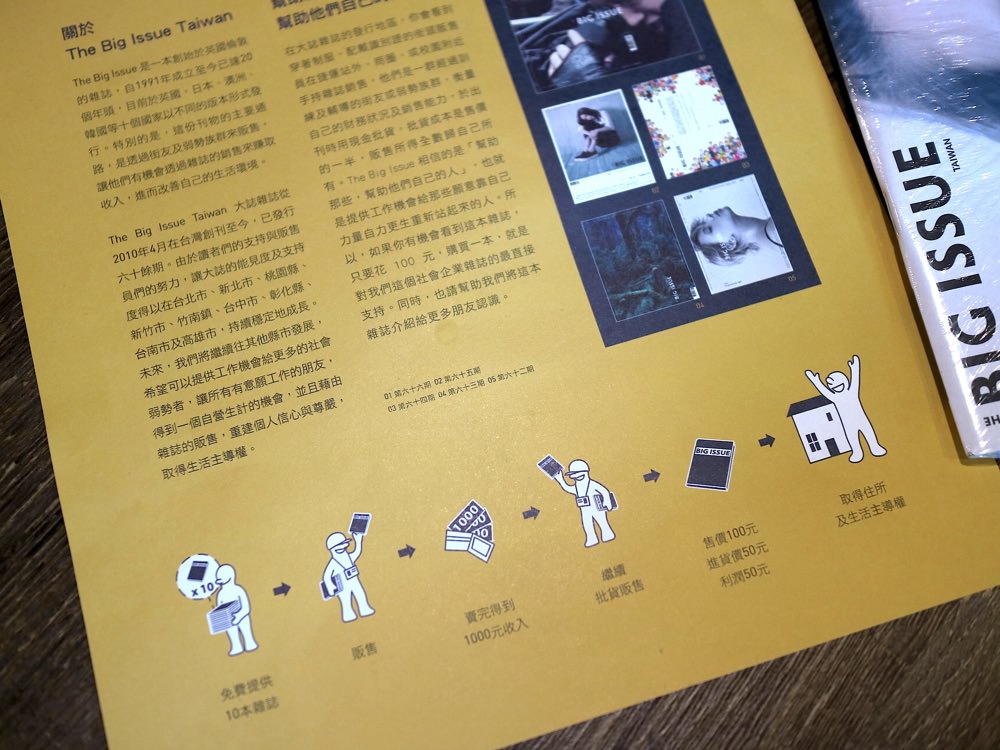這次來這間咖啡店,才正式接觸到這個『大誌雜誌』。簡言之,就是這是一本介紹國內外時尚或文藝活動的國際雜誌,在全世界多個國家都有販售。一本一百元,當你購買時有一半的收入是給這群販售雜誌的弱勢團體,另一半則是雜誌的印製支出。透過這個公益雜誌,讓街友或弱勢族群擁有自己謀生的能力和收入!滿新穎的公益觀念,介紹給大家知道,也歡迎大家如果看到有人在販售這本雜誌,歡迎支持他們喔~