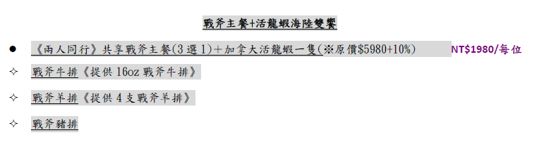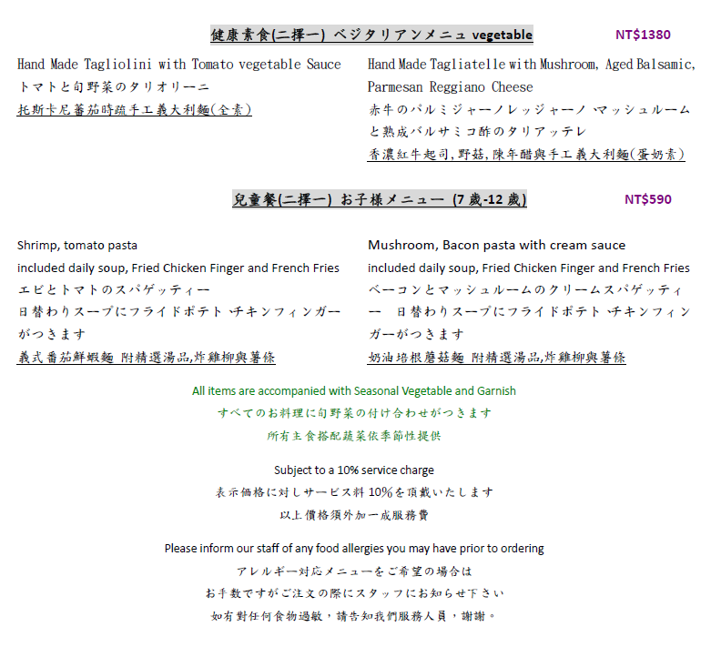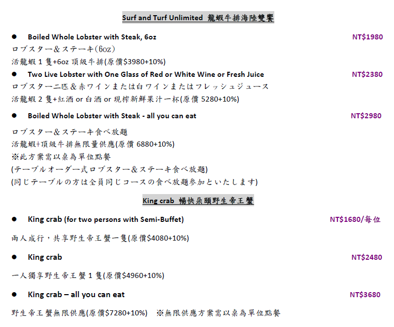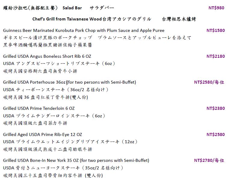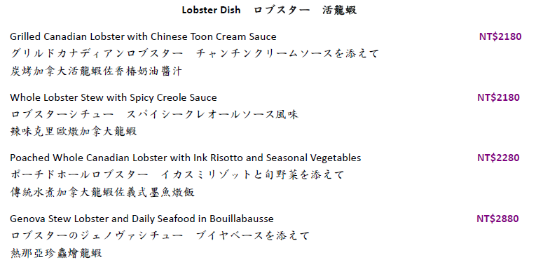 午餐菜單和晚餐基本上是一樣的,只有幾道菜差$100~200元左右,就不重複放菜單截圖上來了。