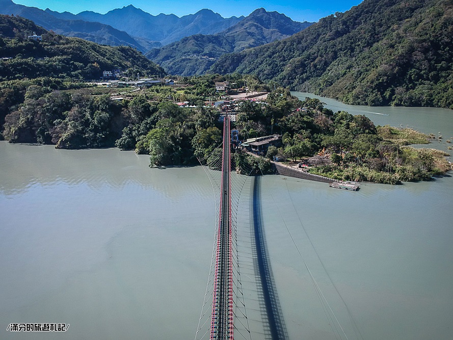 鳥瞰新溪口吊橋,周圍是青翠的綠色山景