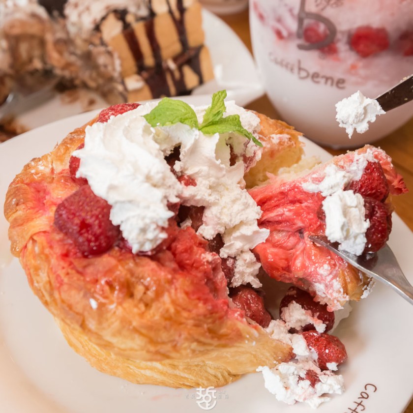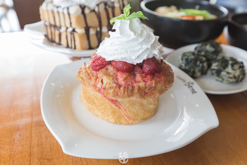 派司脆麵包有點像丹麥吐司,吐司外層是脆脆,而裡面是柔軟的,再搭配酸酸的草莓淋上甜甜的醬,在韓國是一到相當有特色的甜點。