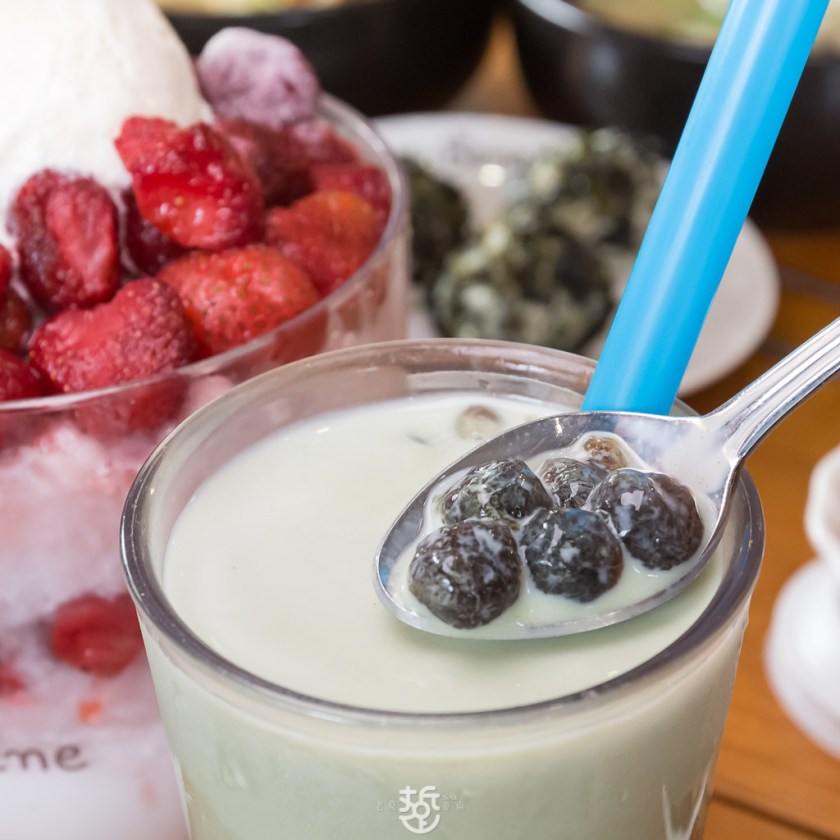 刨冰裏有加韓國進口的Base醬,讓冰不會這麼快的融化,刨冰是粗的碎冰,口感更佳。用長湯匙由上面至下往上調勻是正確的吃法。上頭是草莓果粒與一球香草冰淇淋,適合點一碗兩人一起同樂分食享用。