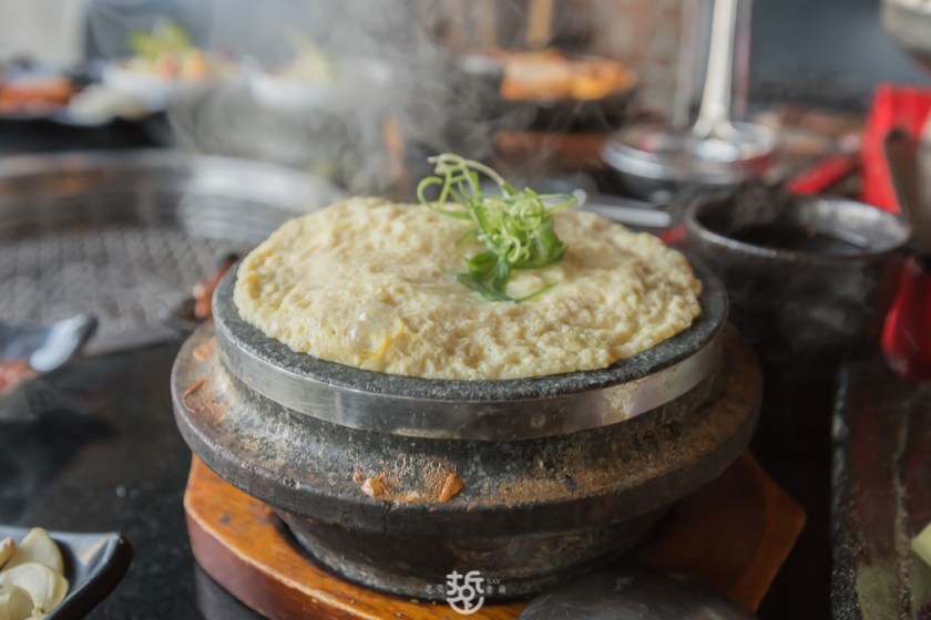 這是功夫料理,火候的控制很重要,趁熱端出來時,非常有視覺張力,蓬蓬的直冒煙。與日式蒸蛋滑順的口感不同,韓式蒸蛋雖說是蒸蛋,但有煎蛋的焦香。