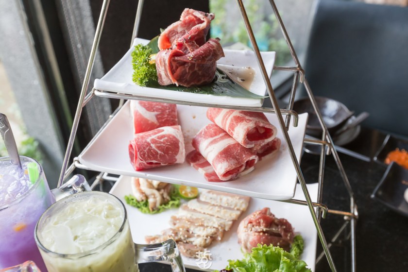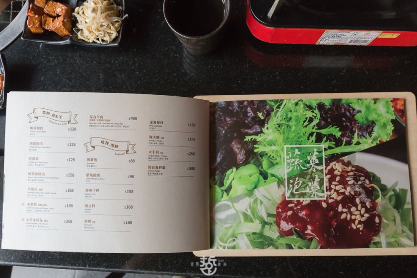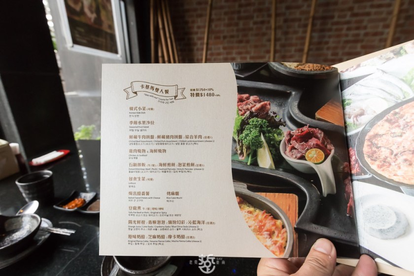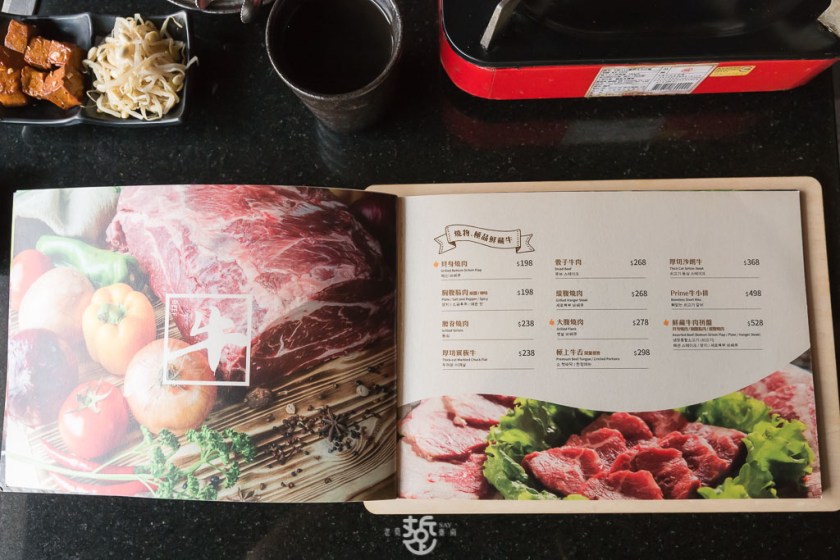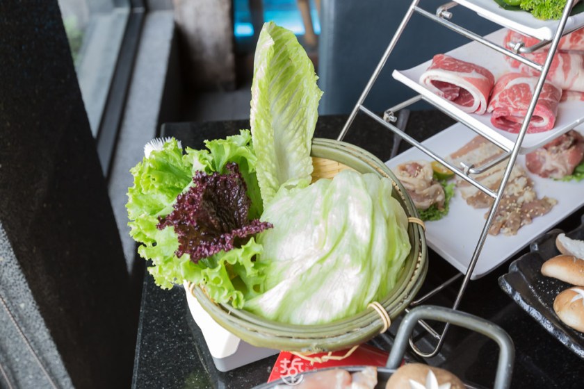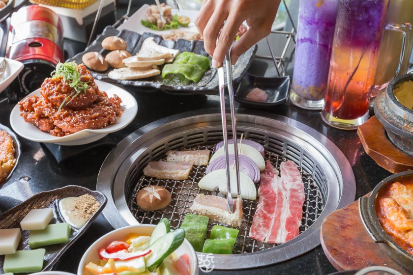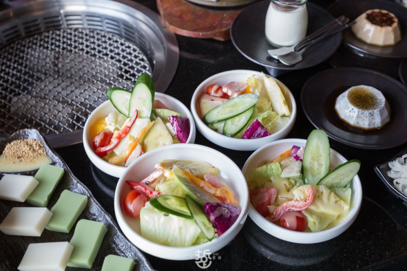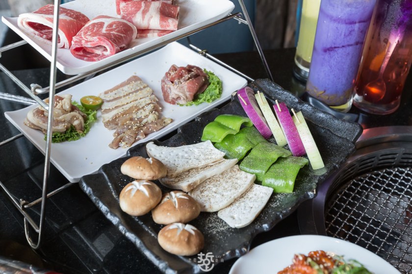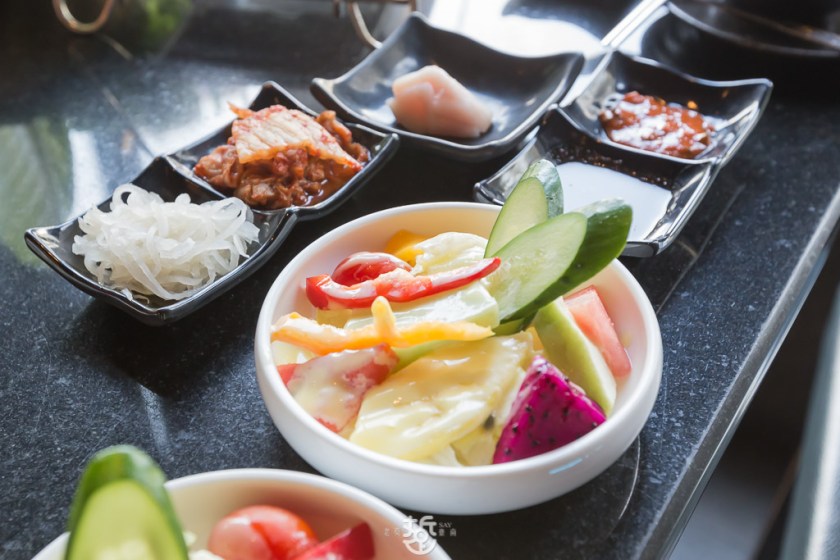 開始來介紹到底有哪些好料?就從肉盤塔開市介紹起。包含嚴選牛五花、雪花牛肉、翼板牛,底層韓燒豬肉、豆醬豬五花、雞腿肉。烤好的肉,搭配包食生菜吃,生菜不夠可以再續。桌上小菜、泡菜,可解膩,吃法多樣化,單獨沾烤肉醬汁不錯吃。