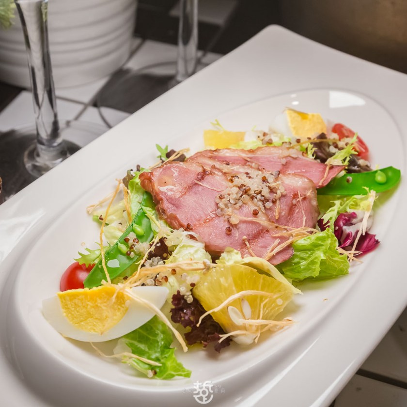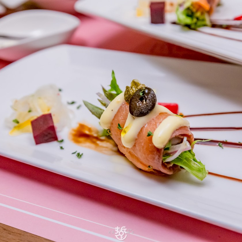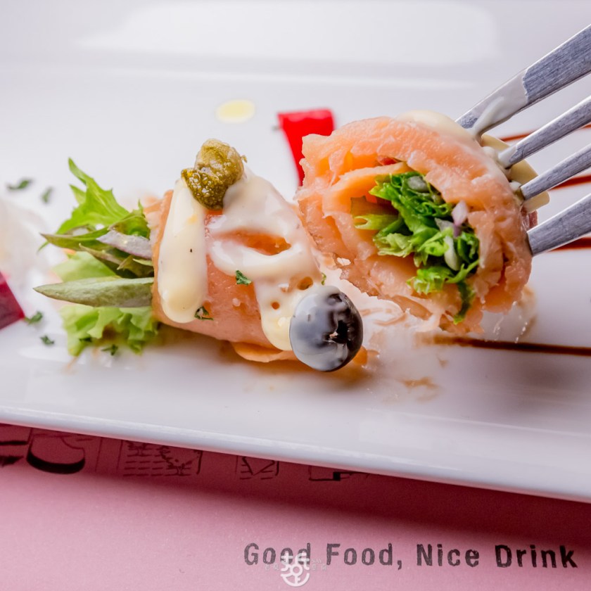煙燻鮭魚裡頭包著捲鬚生菜、洋蔥,淋上芥末醬並以黑橄欖做裝飾,生菜與鮭魚最嘴裡的口感相互佐襯。