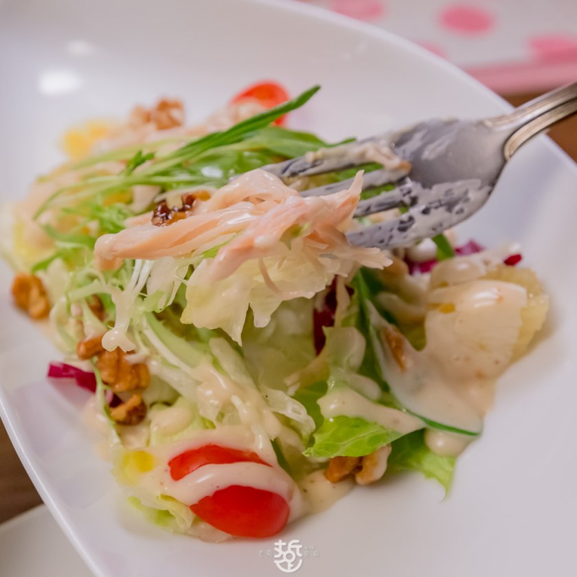 有水果丁、芝麻葉、蜜核桃、捲鬚生菜…等,沾滿胡麻醬汁的雞胸肉絲,口感滑潤不柴。