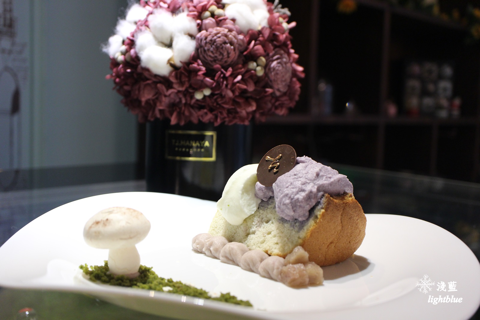 最後店家又熱情地送上紫芋雲朵蛋糕切片,這時我已經飽到天靈蓋了,可是看到蛋白霜做成的蘑菇裝飾又讓人忍不住想嚐嚐看