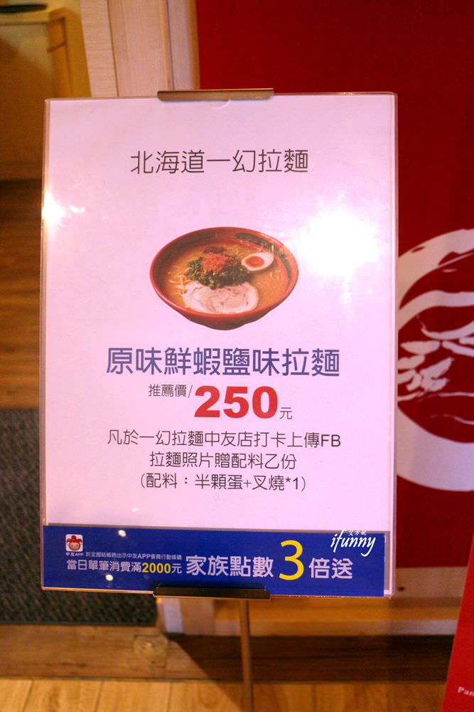 北海道北海道えびそば一幻拉麵台中店位於中友百貨A棟B3,雖處於美食街,但有獨立的用餐空間。
