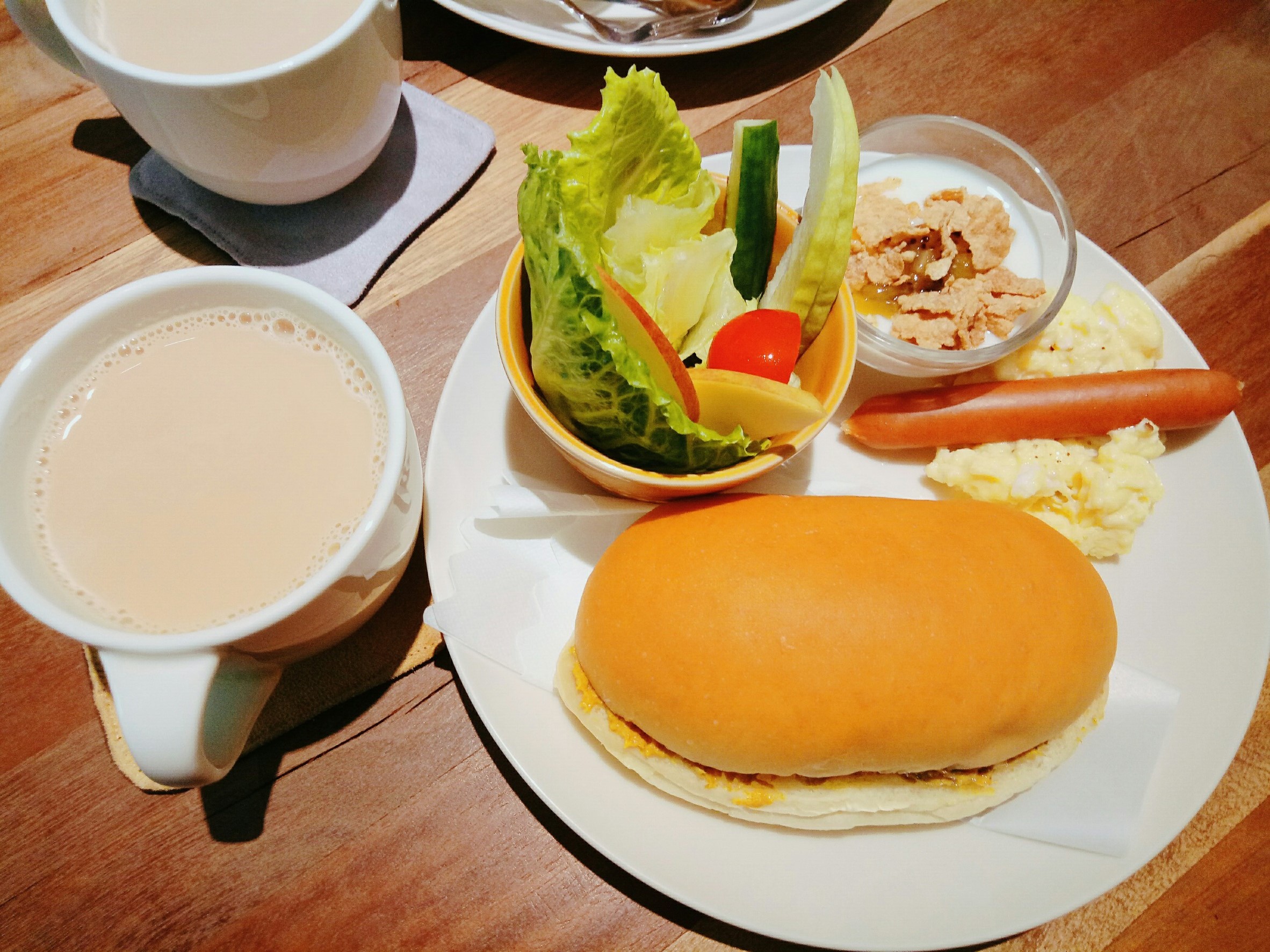 我點的是C套餐,有餐包、熱狗、嫩蛋、沙拉、果醬優格,和飲品,