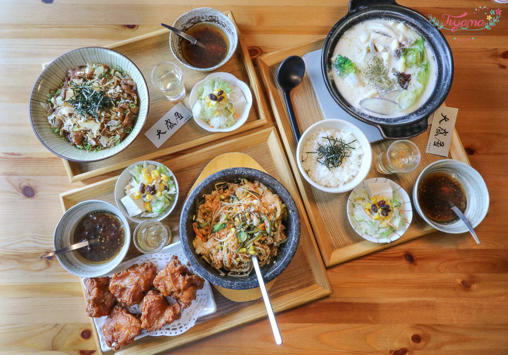 來看看…期待的菜單有什麼好料,日式料理,有:洋食、醬燒、烏龍麵、養生小陶鍋、和食飯糰、炸物。韓式料理則有:石鍋拌飯、鍋物、小菜,還貼心設計”素食菜色”,和素食朋友來聚餐也OK。