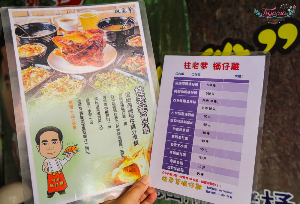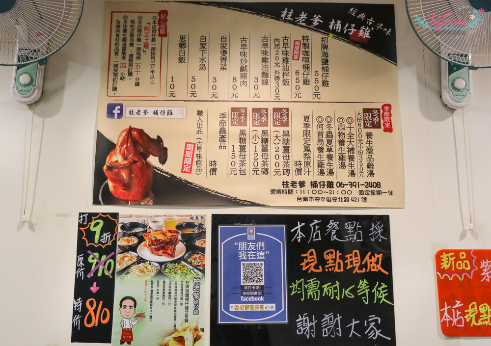 想吃什麼?看牆面的大菜單最清楚,上次吃的3~4人分享餐,不收服務費,還打9折…CP值爆高的。食記也大獲好評,可參考這裡【台南安平美食|柱老爹 桶仔雞】