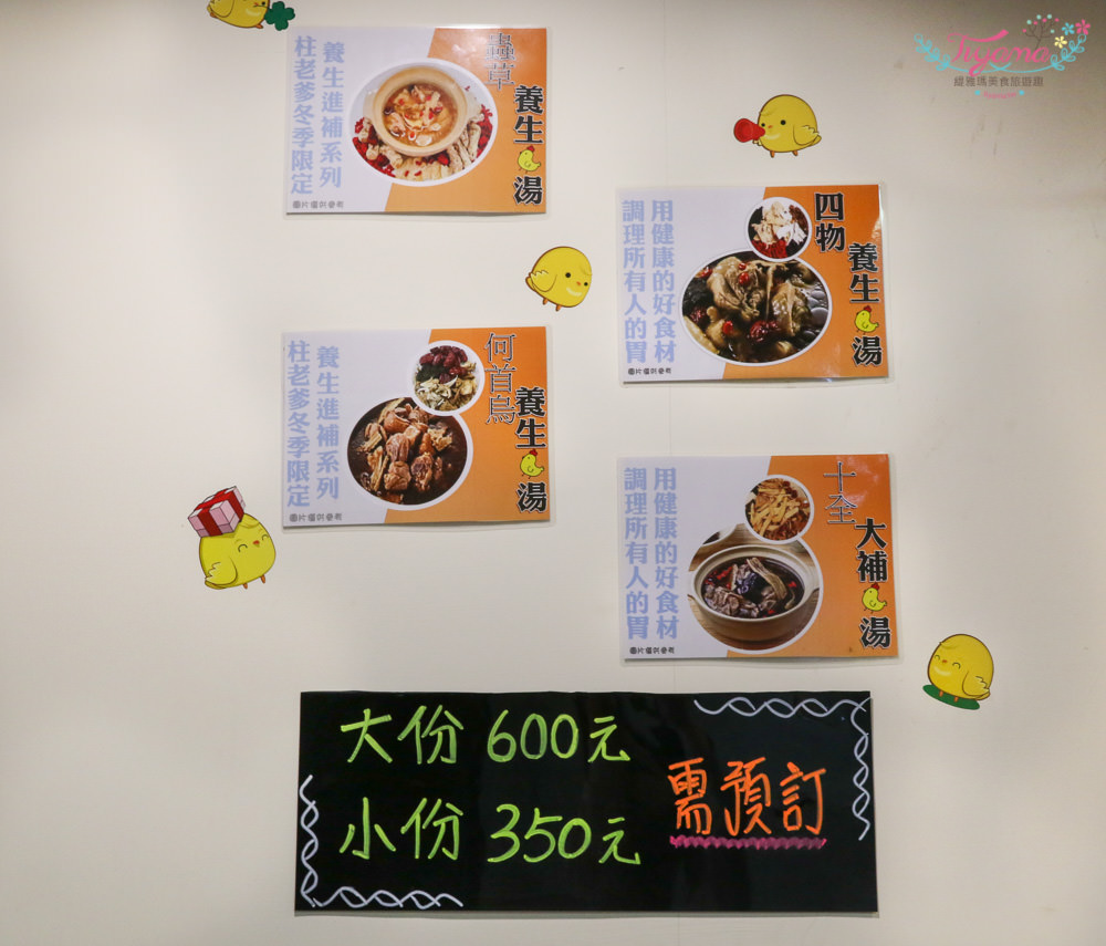 冬季限定的養生燉品雞湯,有四款:冬蟲夏草養生湯、四物養生湯、何首烏養生雞湯、十全大補養生湯。堅持不使用事先燉煮冷凍,採現點現煮現燉,需提前3~4小時預訂,大份600元、小份350元。