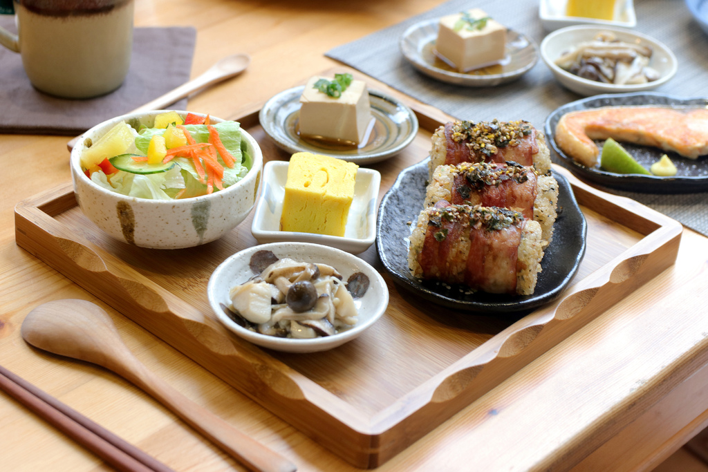 ▼培根捲捲 $160/ 飯糰皆附季節沙拉、漬物、家常菜2種