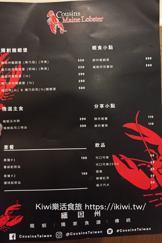 Cousins Maine Lobster菜單上有獨創龍蝦堡,緬因州龍蝦堡(美乃滋)、康乃狄克龍蝦堡(奶油)