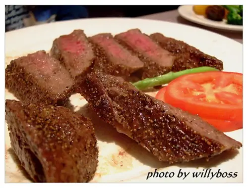 我超愛這道,七分熟的牛小排外酥內嫩,一咬進嘴裡,肉汁四溢啊!濃濃的牛肉香氣,只在牛排的外層用一些黑胡椒等辛香料調味,沒有醬汁,可以吃到最新鮮的牛肉原味!份量雖沒台塑牛排的誇張,但也是很大一份。另外在主菜上之前有上一些小配菜,高纖維蔬菜和酸梅湯,我只有隨便嚐一點,所以就忘記拍了...(肉食主義者)