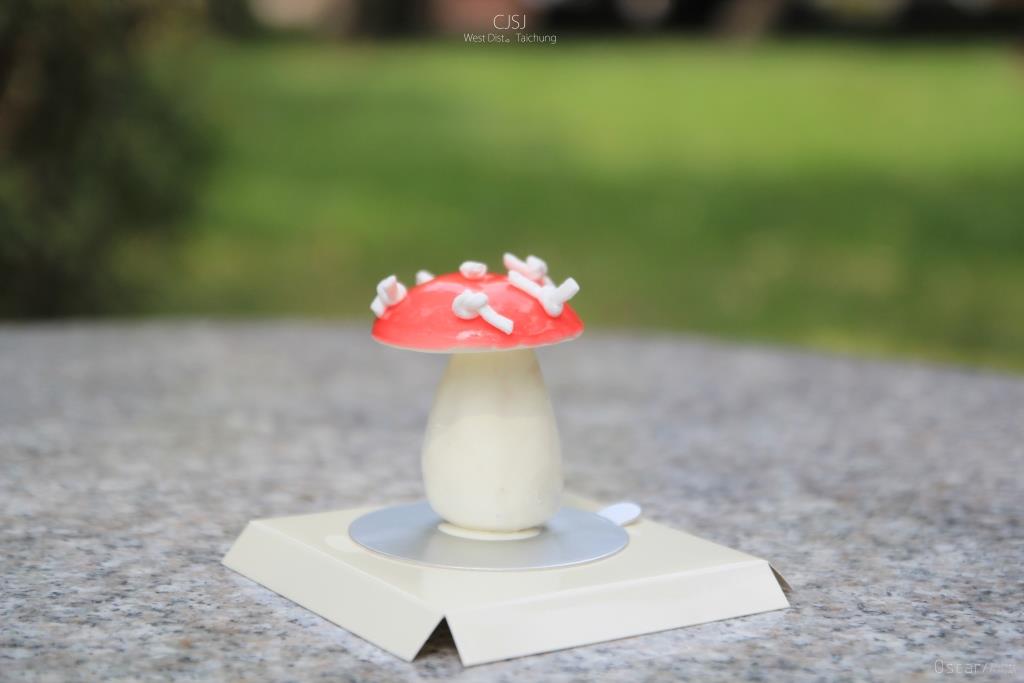 鮮紅蕈傘中包覆著牛肝菌甘納許 而雪白的蕈柄內則是包覆了覆盆子果泥與奶油脆餅
