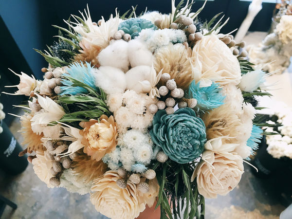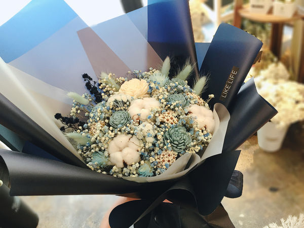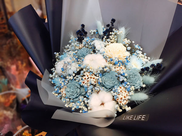 這款是以藍色、白色木玫瑰為主花,搭配棉花等其他花材去襯托。
