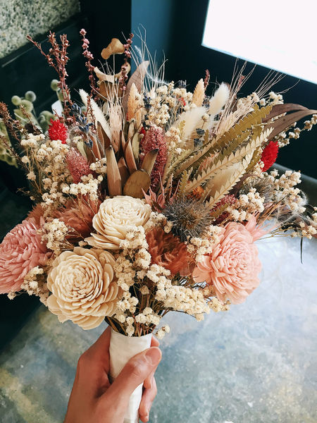 韓式捧花則是近幾年流行,相較圓形捧花,韓式捧花會使用花材去做出高低層次感。