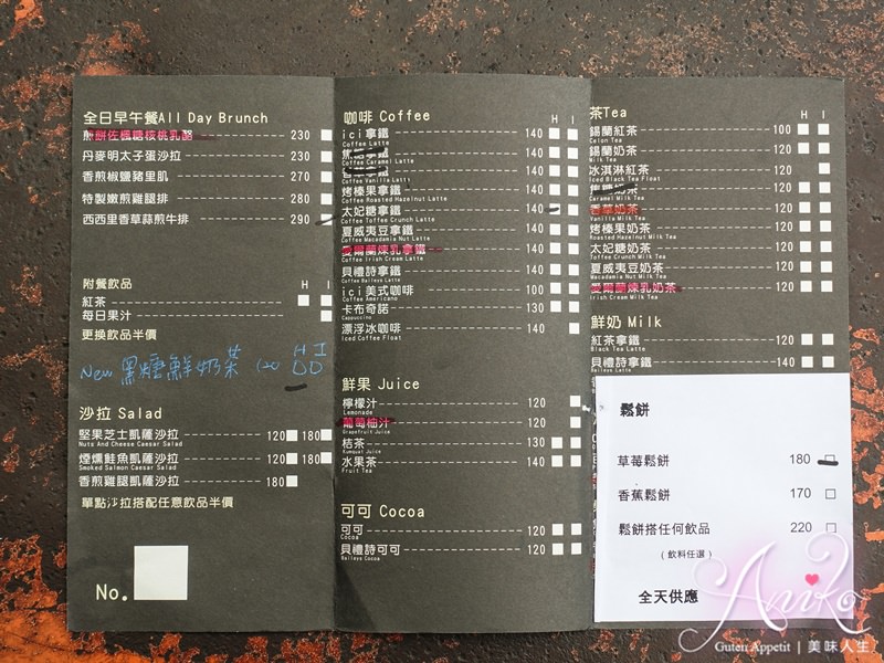 ici cafe菜單,店內以販售早午餐為主!!! 艾妮可今天主要是為了草莓小鬆餅而來,