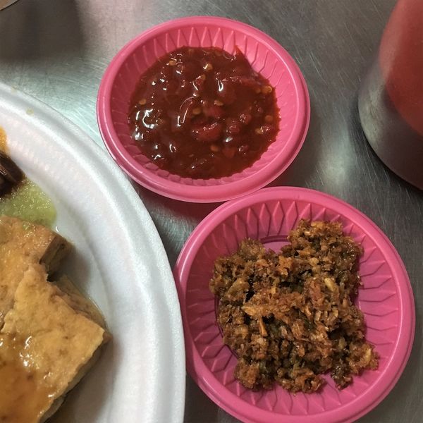 再來就是吃麵線&小菜一定要搭配的辣椒醬&油蔥酥~ 喜歡吃辣的可以點辣醬 ((好吃 微微辣辣的很爽唷~