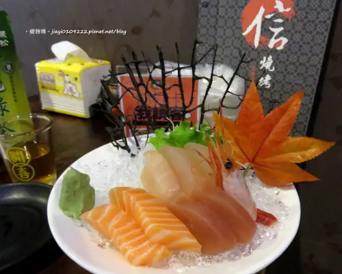 綜合生魚片220元,這擺盤雖然簡單但是很高雅,裡面有旗魚、鮭魚、鮪魚與甜蝦等,旁邊的芥末應該不是使用新鮮山葵磨成的。