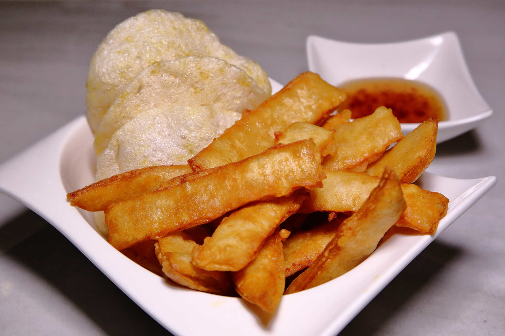 一般我們到泰式餐廳吃的是圓的月亮蝦餅,這裡的蝦餅是炸成長條型?!