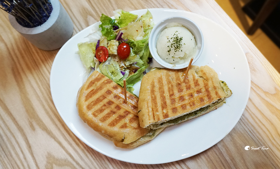 有二塊帕尼尼、馬鈴薯泥、生菜沙拉,清爽健康的組合。