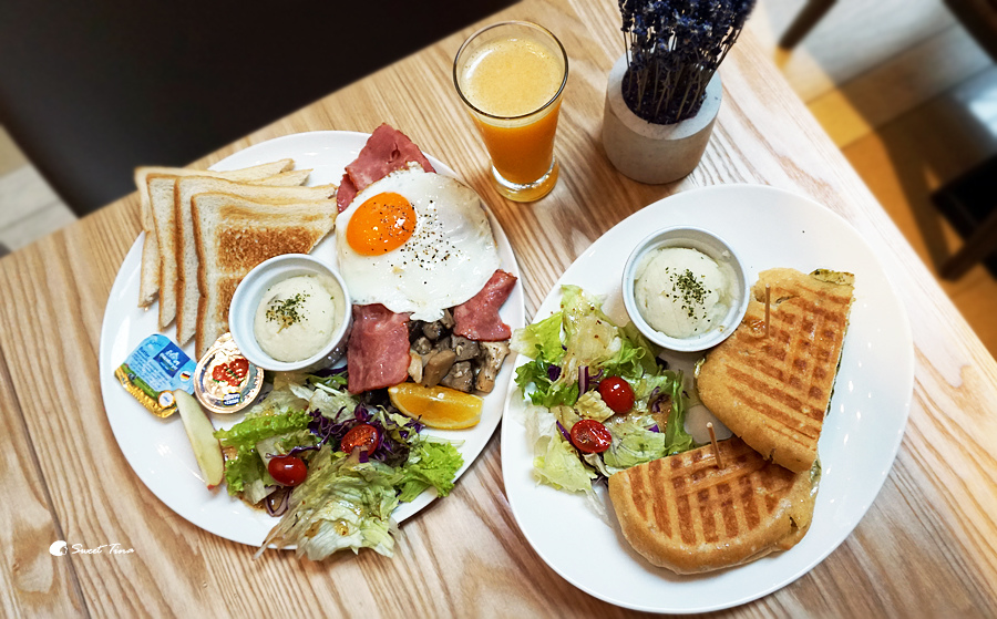 這天我們就點了一份太陽蛋漢堡排早午餐(選擇果汁)、青醬奶油雞肉起司帕尼尼。