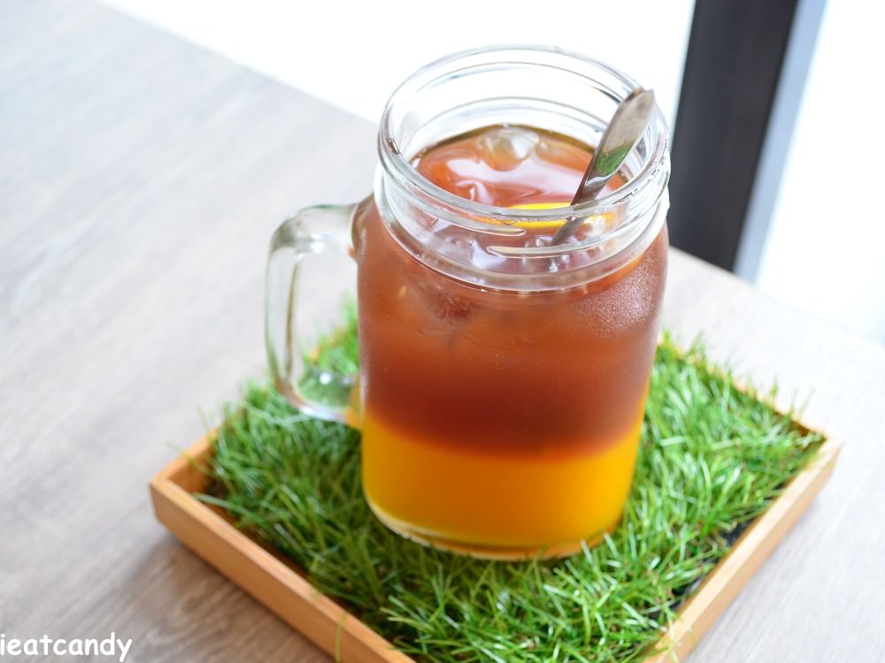老公點的新鮮水果茶,第一次看到水果茶有漸層~底部是柳橙+百香+檸檬,上層是無糖紅茶,攪拌均勻後味道才會較為融合,愛伊特很少喝到這麼特別的水果茶,跟外面賣的不太一樣,偏酸,柑橘類的味道較為明顯。