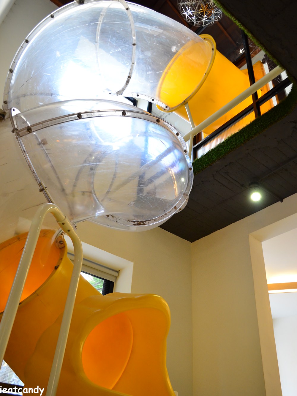 二層樓高的溜滑梯入口就在這!愛伊特看了溜滑梯,覺得對於兩歲內的小孩子來說都還是有點陡,建議父母跟小朋友一起會比較安全。
