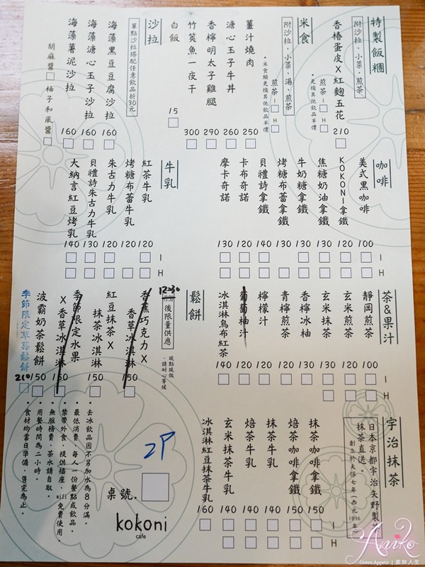Kokoni cafe的菜單~ 提供日式早午茶,種類簡單,飲品選擇較多些~