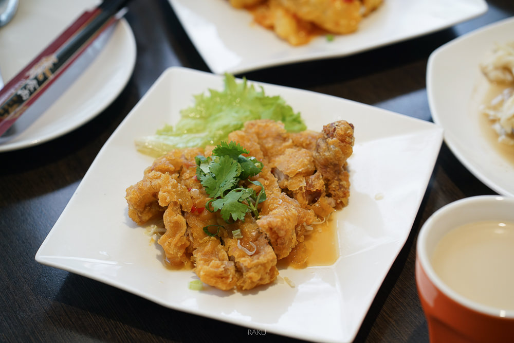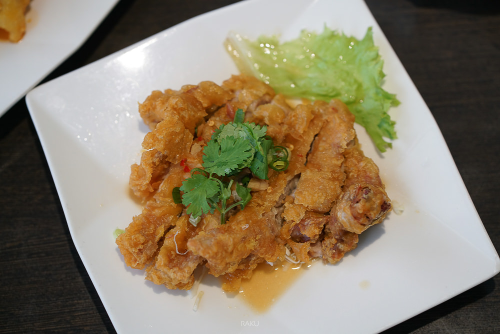 以檸檬酸味為主要調味的泰式檸檬雞,不意外地非常下飯,雞肉用的是一整隻的炸雞腿排,雞腿肉口感挺厚實的,只有邊緣有一小塊骨頭。