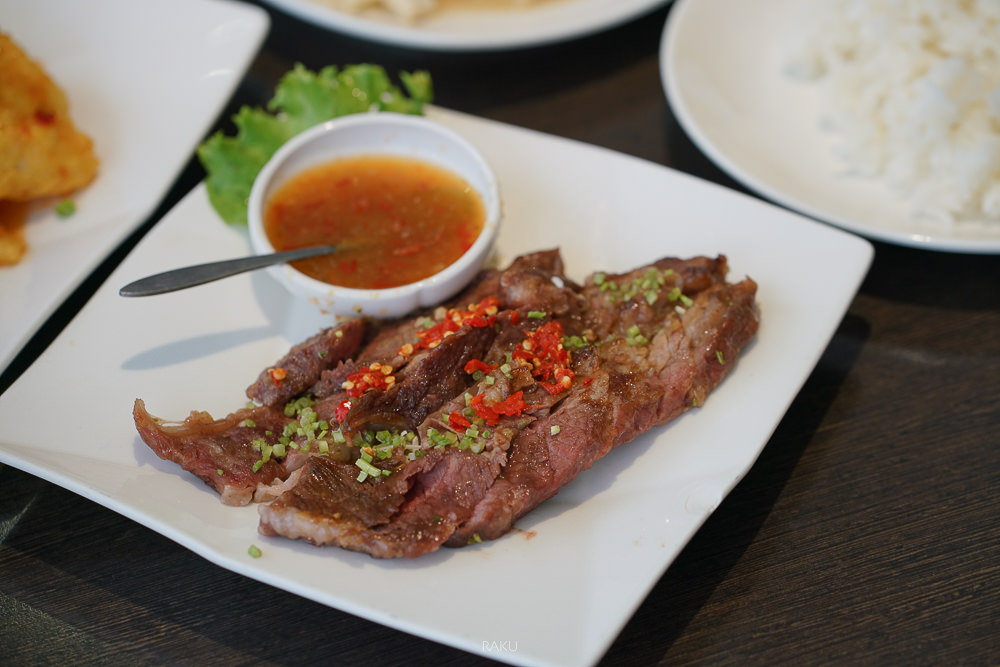 這樣份量的牛小排只賣250元其實還挺划算的,不過千萬要注意上頭的紅辣椒,辣度相當驚人,不小心配著牛小排一口吞下去,辣到我差點把整杯泰式奶茶給乾了。