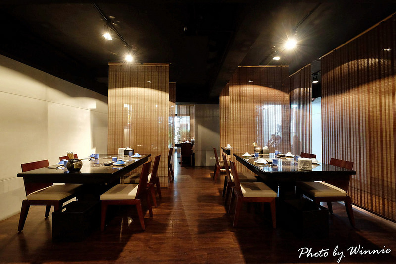 透著柔和的間接照明燈光的垂吊竹簾,讓整個空間充滿穿透感,再搭配上黑色的大理石桌面及深色的木質餐椅整齊地排列,完全就是個典雅宜人的用餐環境