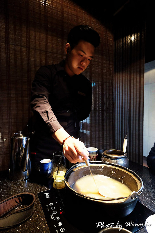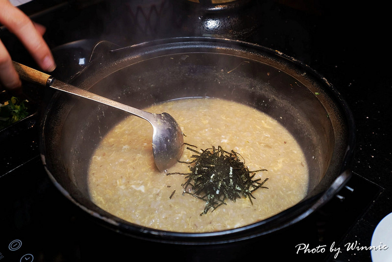 ▲過程中服務生會不停的攪拌著鍋中的食材,慢慢的收汁讓白飯吸收滿湯底滿滿的精華,才算大功告成完成煮雜炊的料理
