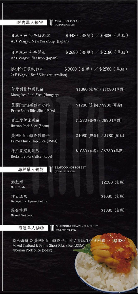 ▲剛剛上面介紹的都是雙人鍋物,而一個人也想吃頂級的火鍋時怎麼辦?貼心的囍聚也幫大家設想周全了,誰說吃火鍋只能成雙成對的,這裡也有提供單人份的鍋物料理,來填補大家心靈跟胃的空虛感哦!!
