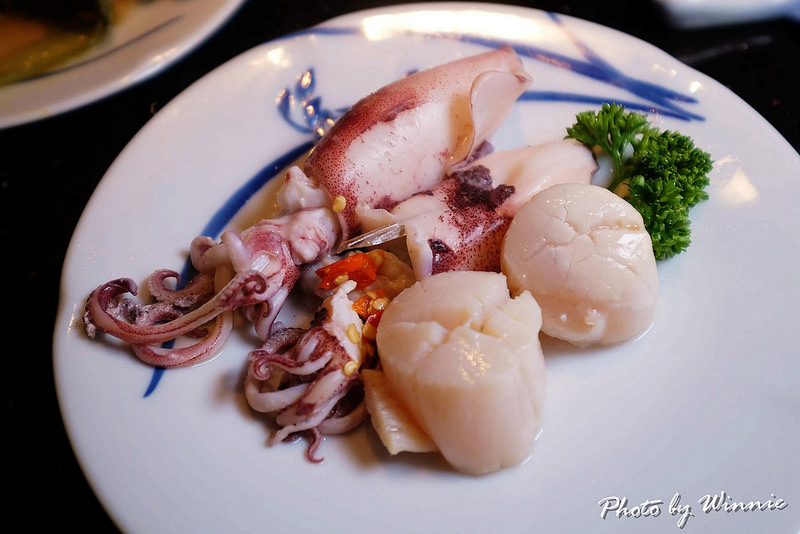 ▲前菜:特選刺身,以三種不同的生魚片來做組合搭配,除了鮮嫩無比的鮭魚及旗魚刺身外,鮮甜彈牙帶點炙燒香氣的干貝也十分的美味