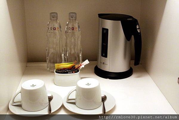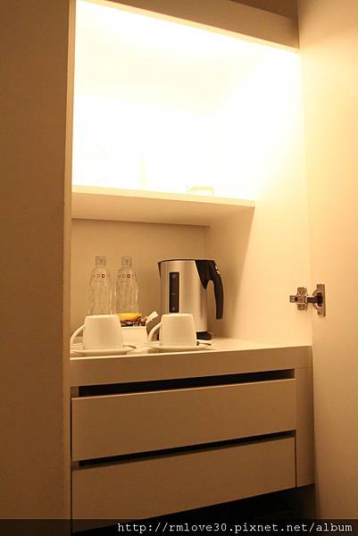 打開隱藏式的邊櫃,就可以看到電熱水壺跟飲用水,上層還有兩種酒杯