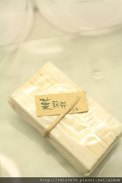 肥皂盤上放著一個茉莉花手工皂,但說實話整體質感跟浴室不搭