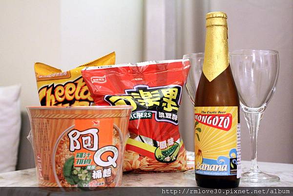 只要到外面住,熊跟喵就會買碗泡麵邊看電影慢慢吃,這次再加上兩包熊喵最愛的餅乾跟香蕉啤酒