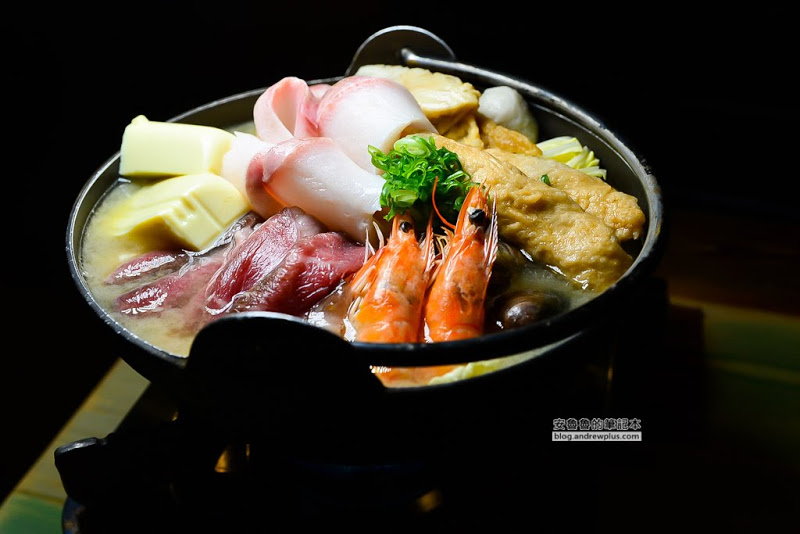 以味噌湯為湯底底,上面鋪滿了海鱺魚、和牛肉片、鮮蝦、蛤蜊、白菜、黑輪、嫩豆腐、甜不辣等食材,看起來超級豐富