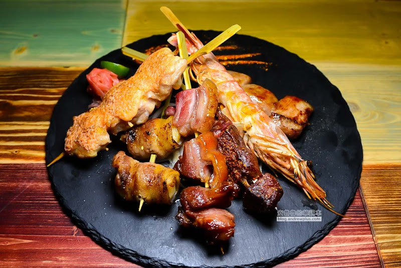 裡面有肉質軟彈帶甜味的鹽烤天使蝦;豬皮烤的焦脆,肉質厚實有嚼勁的烤酥皮豬腳串;肉質軟甜多汁上面塗上一層明太子醬的明太子雞肉串;口感超好咬起來有彈性適合下酒的厚切松阪豬;烤的微焦帶有油脂芬芳的五花豬肉片包裹著軟嫩干貝的豬五花干貝串;以及吃起來有嚼勁一時之間沒分辨出來的嫩嫩嫩牛串,旁邊附有紅薑、金桔、洋蔥絲和七味粉可隨意搭配著吃