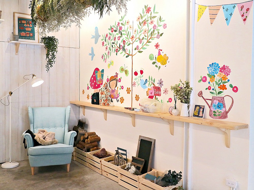 整面的彩繪牆,可愛女孩和貓咪,超繽紛又放鬆~