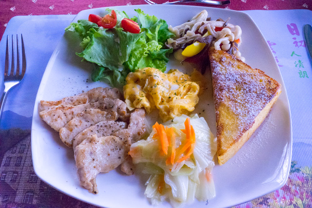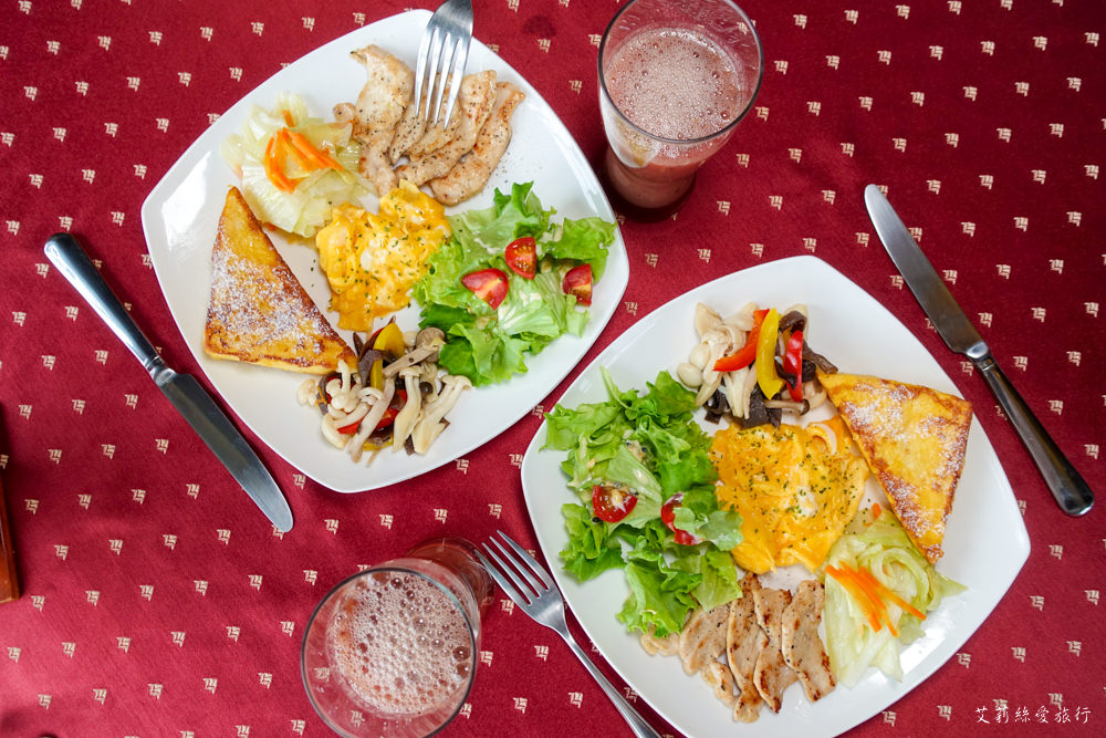用完粥管家居然又端上了這一大盤的豐盛早午餐,內容有現採的生菜沙拉、歐式滑嫩炒蛋、法式土司、現炒菇類、主廚特製雞胸肉和清甜的高山高麗菜,每一種都很美味,再喝一口現打果汁,真是太棒了
