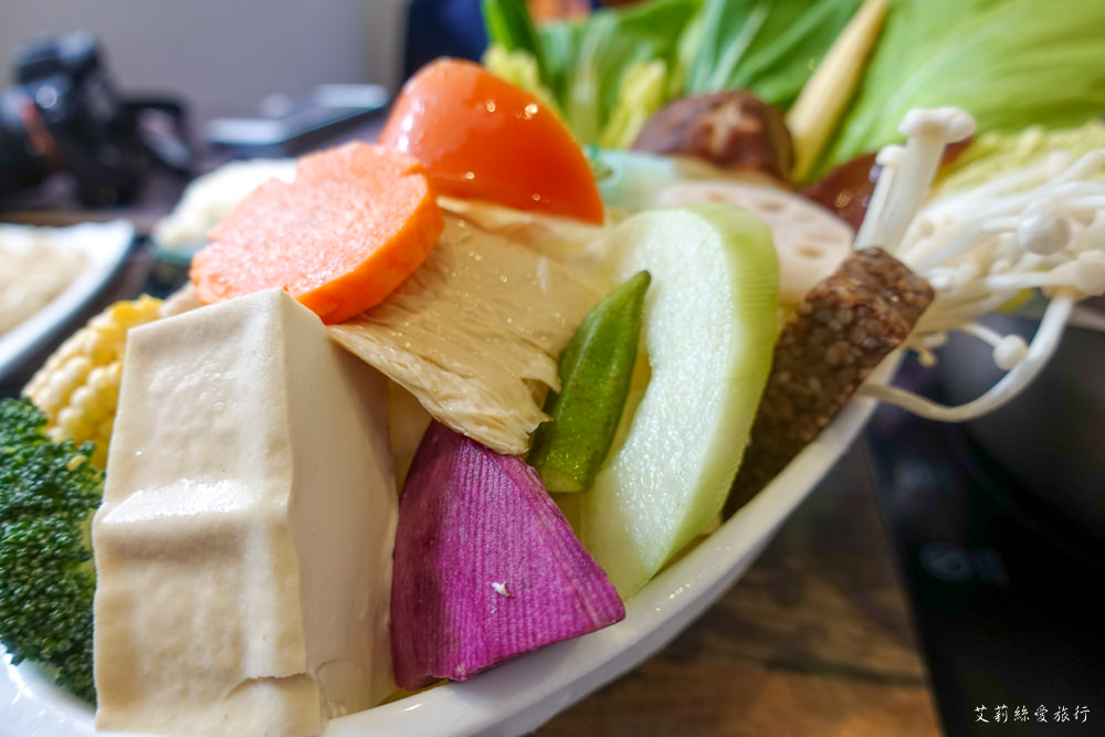 菜盤有蕃茄、有機豆皮、秋葵、紅蘿蔔、蓮藕、豆腐、黑木耳、花椰菜、玉米、玉米筍、芋頭、紫色地瓜、南瓜、大黃瓜、香菇、金針菇、高麗菜、小白菜、湯匙菜、娃娃菜…等