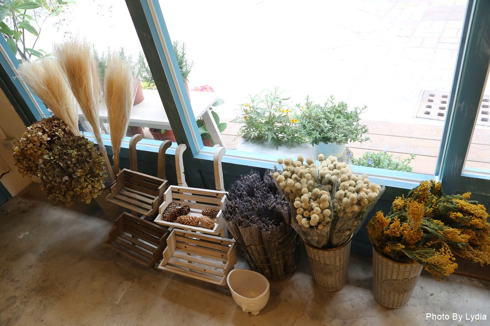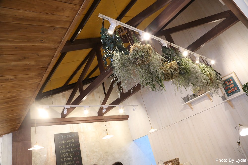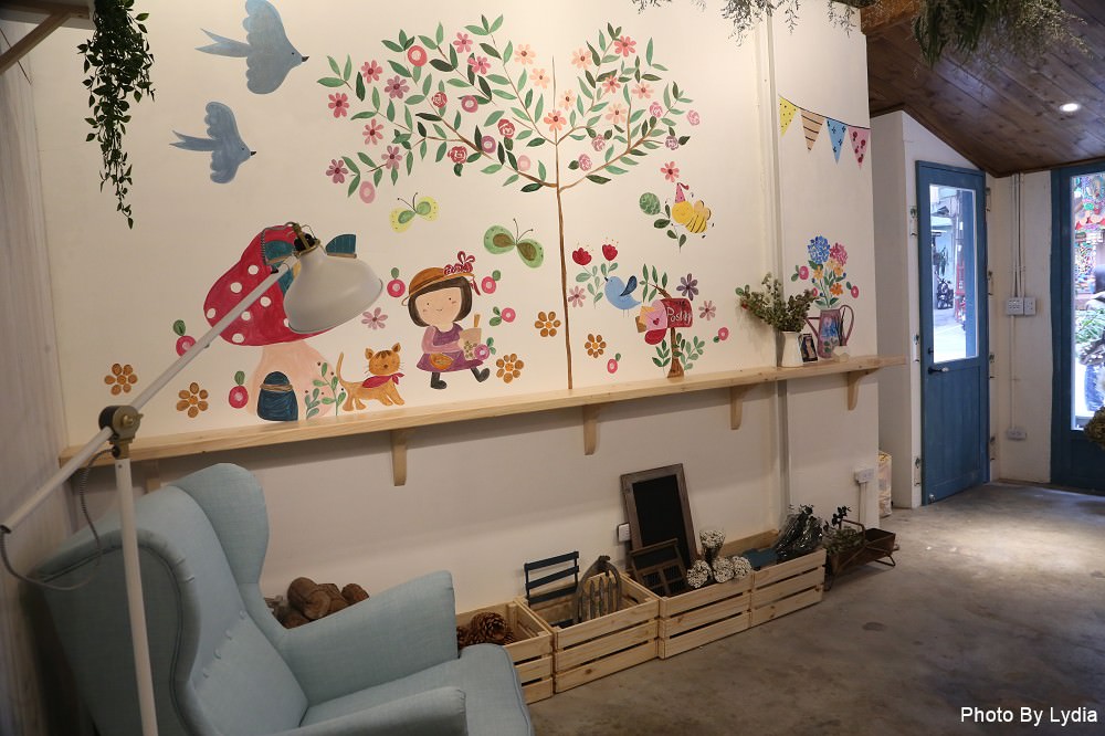 店裡擺設了大量的乾燥花加上這一片大面牆的可愛手繪圖,一整個鄉村文青風。