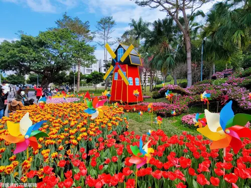 展區在西式庭園花園,搭配荷蘭風車、木鞋、鬱金香造型物,超過20種、3萬株,紅、白、紫、黃、粉、雙色鬱金香和早生的單花瓣杯狀花型,晚生像鸚鵡翅膀一樣的鸚鵡花型,花瓣像鋸齒波浪般蕾絲的羽狀花型鬱金香,有些都還是花苞,會陸續展開